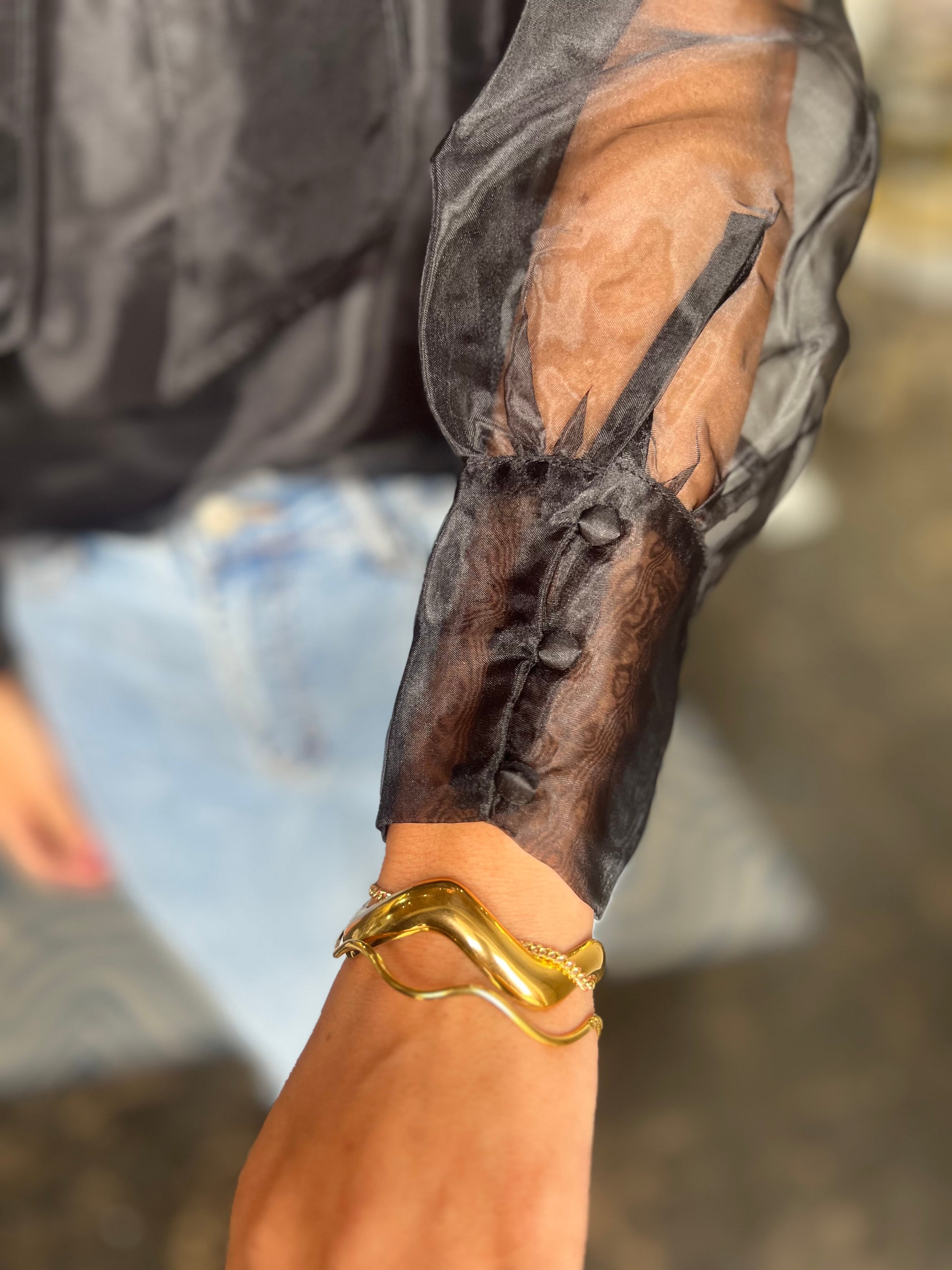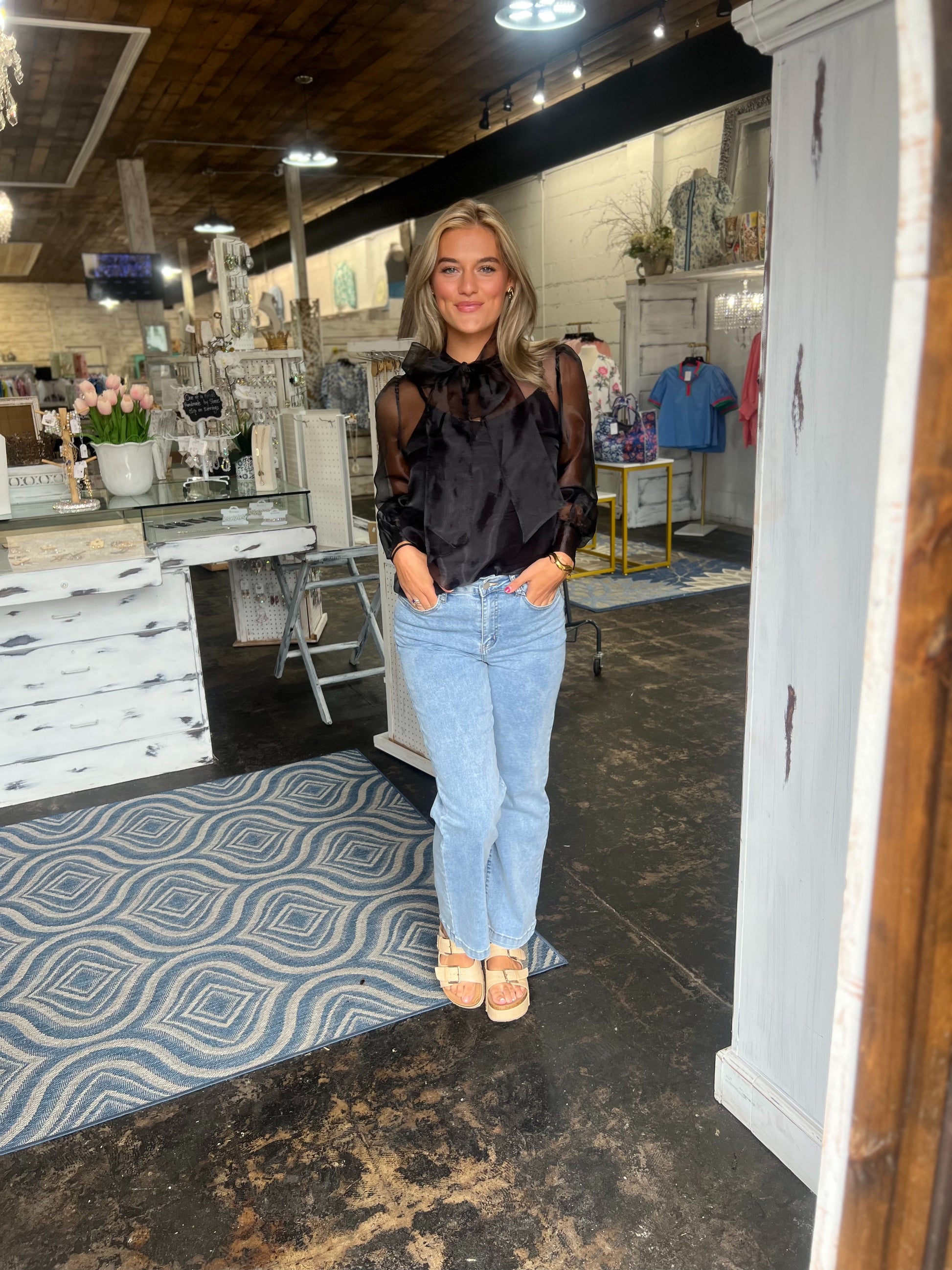 Turn heads with this ultra-chic and sophisticated sheer blouse. Featuring a dramatic organza finish, voluminous sleeves, and a statement bow tie neckline, this top is the perfect blend of elegant and edgy. The sheer overlay is layered over a sleek black cami for an effortlessly put-together look.