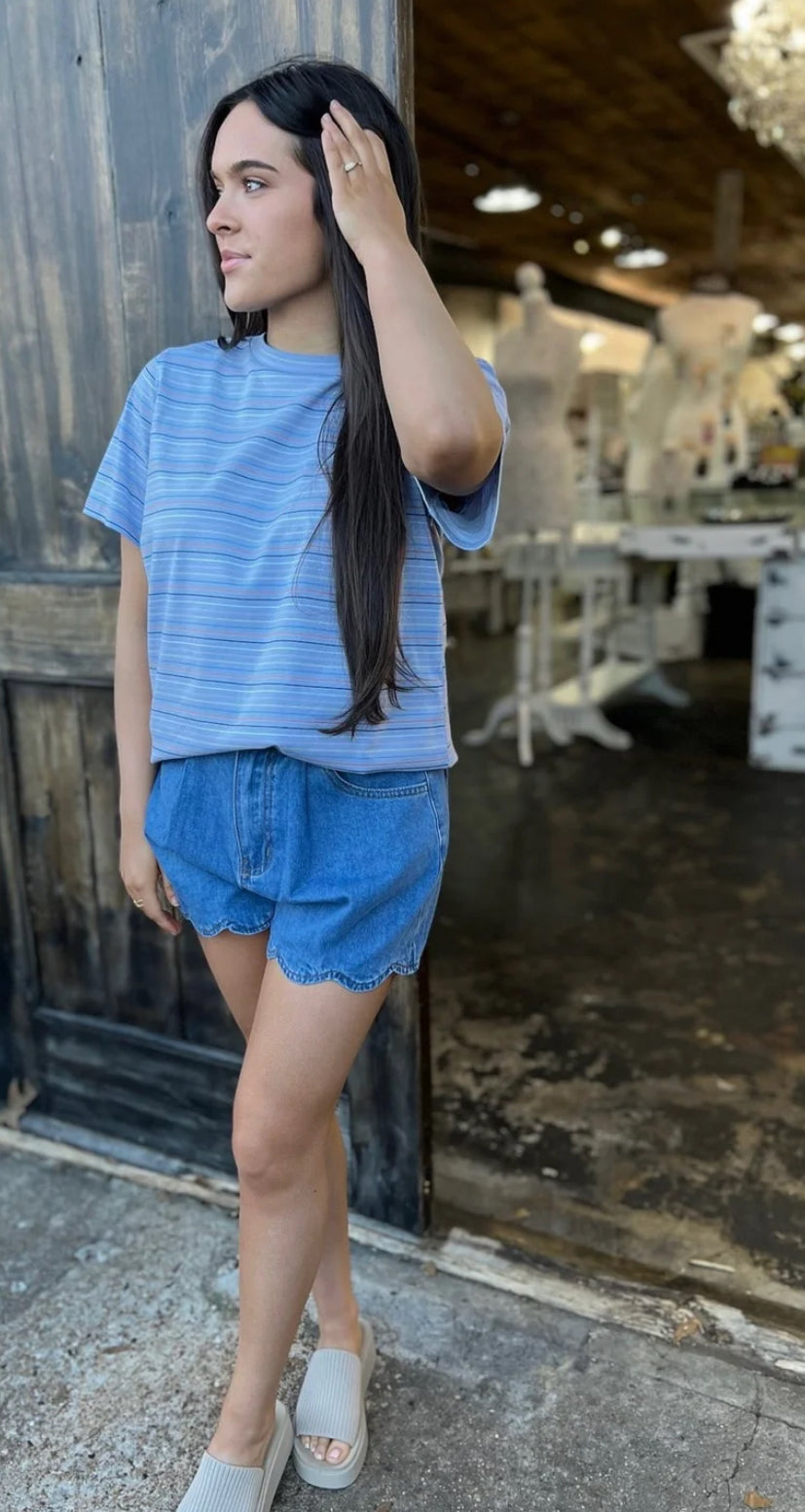 Short sleeve crew neck, multi colored stripe top.