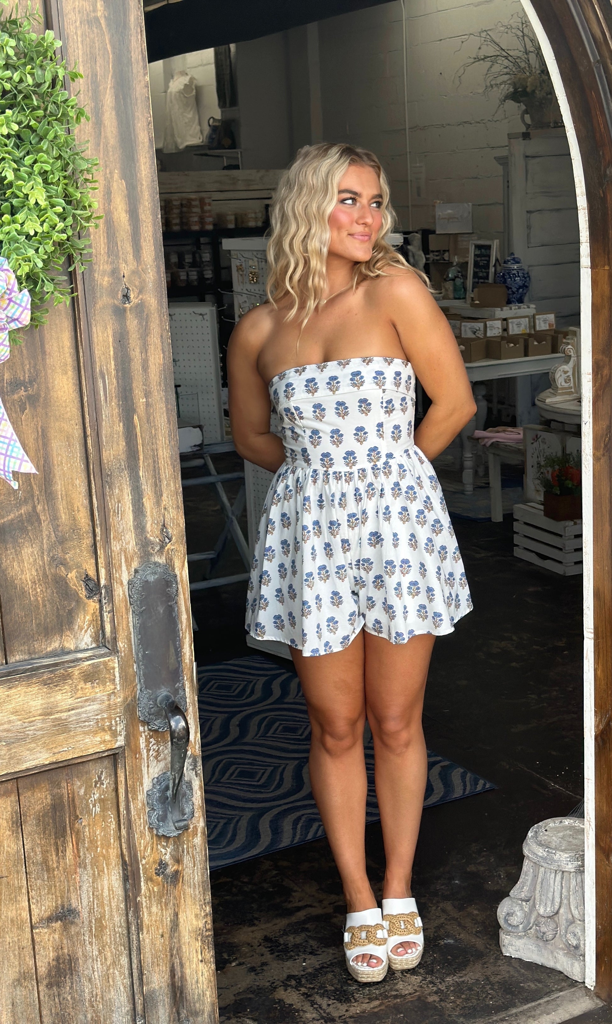 Smocked, strapless bodice and a flattering cinched waist. The soft white fabric is adorned with a delicate blue floral print, while the flowy shorts give the look of a dress with all the comfort of a romper.