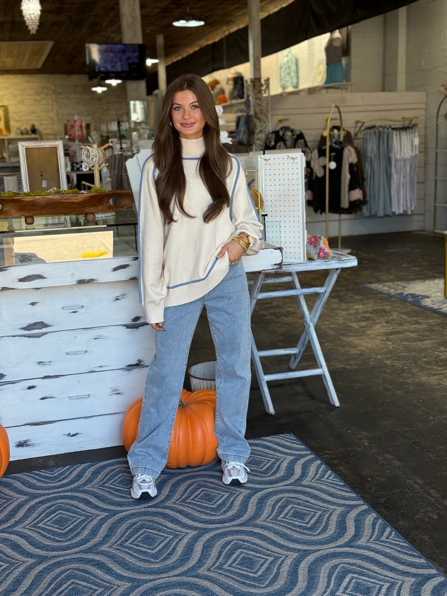 Effortlessly chic and cozy — our Soft Contrast Trim Sweater is the perfect mix of classic and modern. This cream knit features subtle blue piping along the seams, adding just the right touch of color and sophistication. Designed with a relaxed fit and mock neck, it’s ideal for staying warm while looking put together.