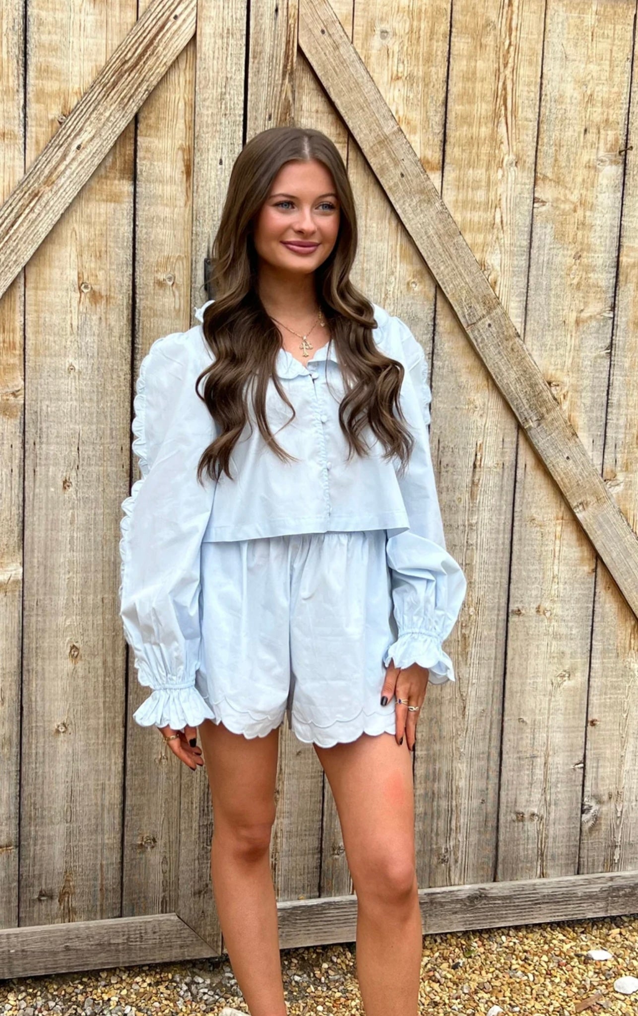 Solid long sleeve with scallop trimming detail. Scalloped collar, with button up front to closure.