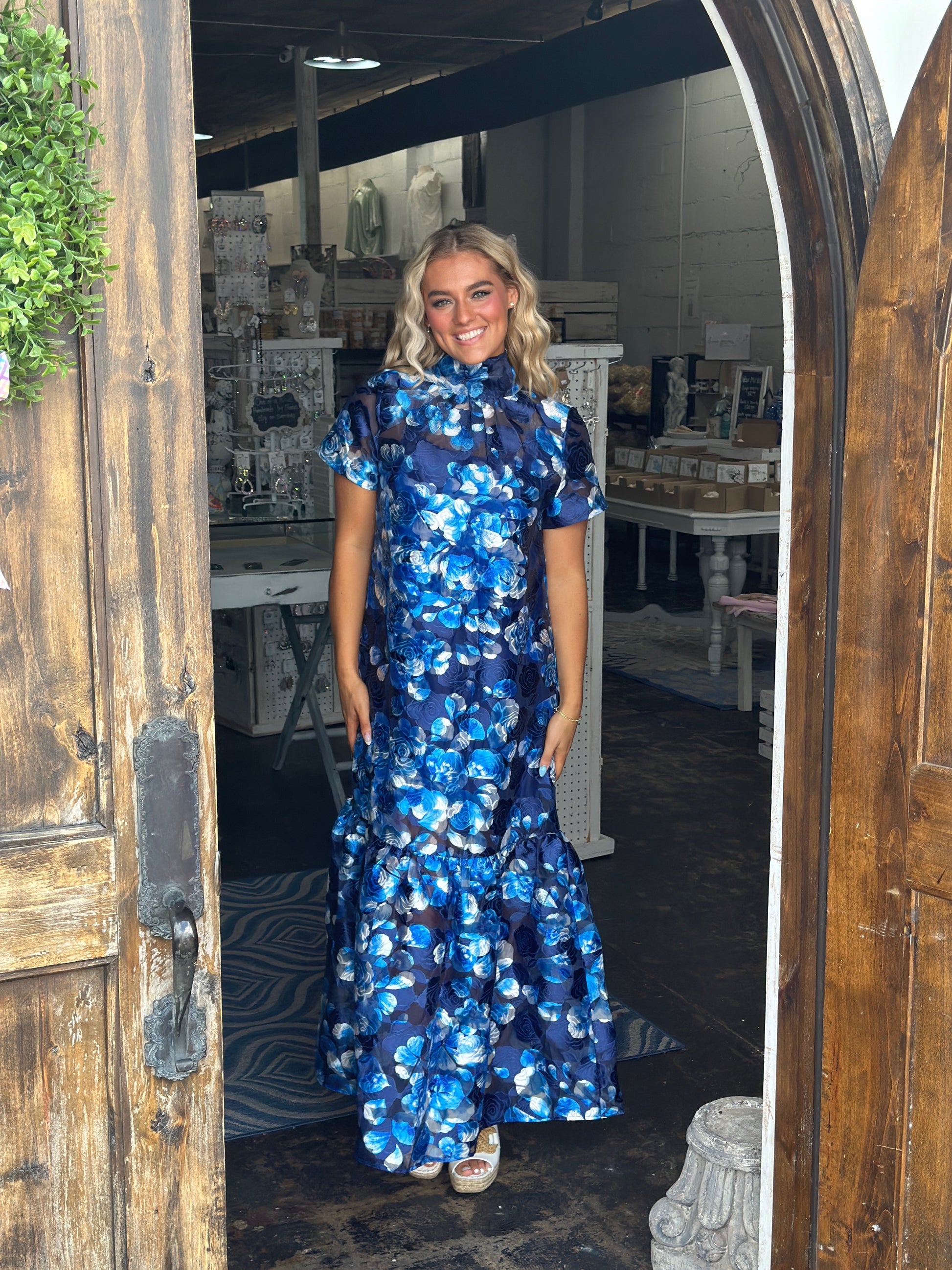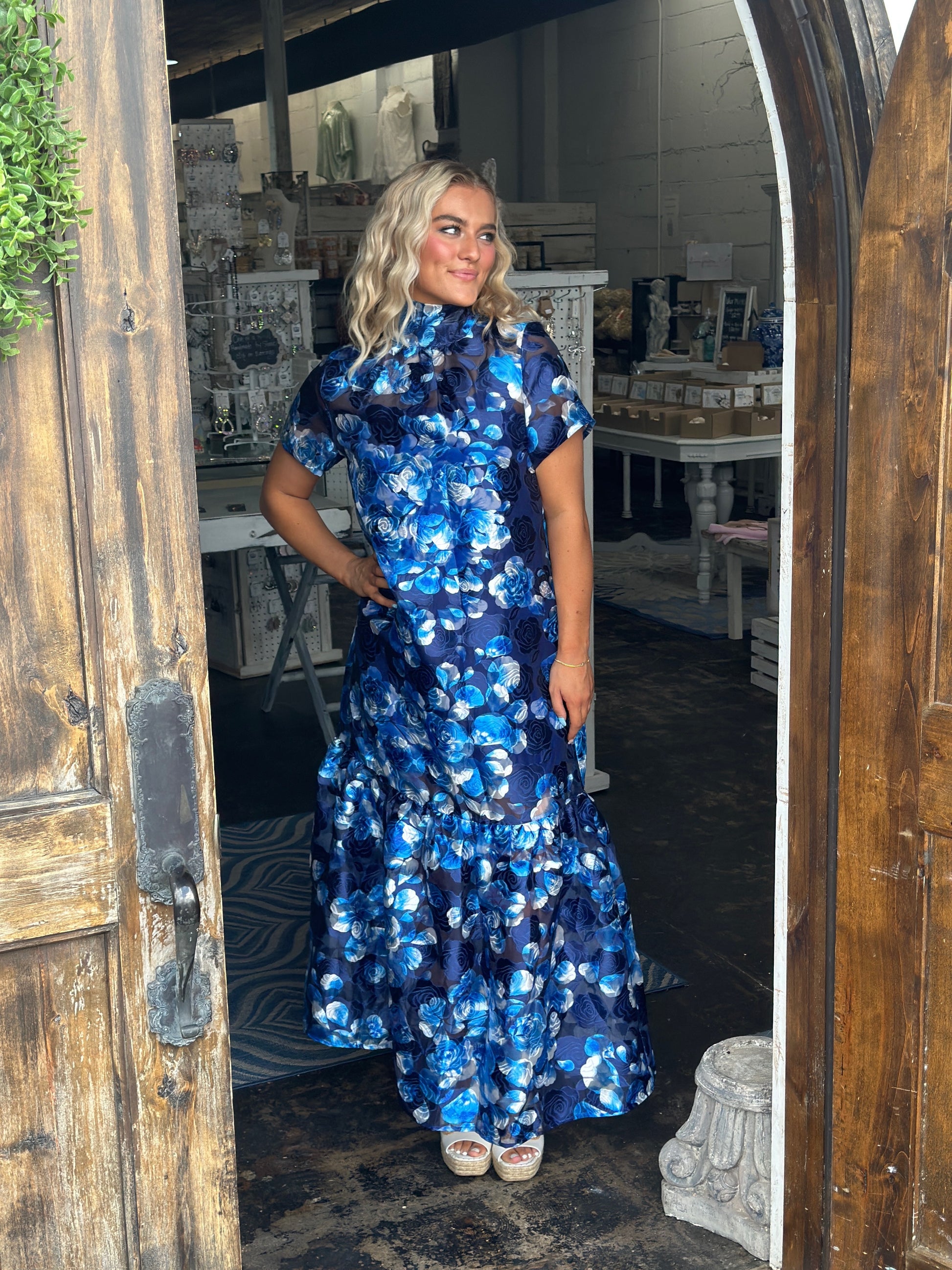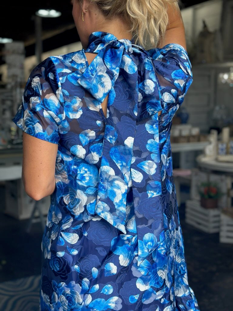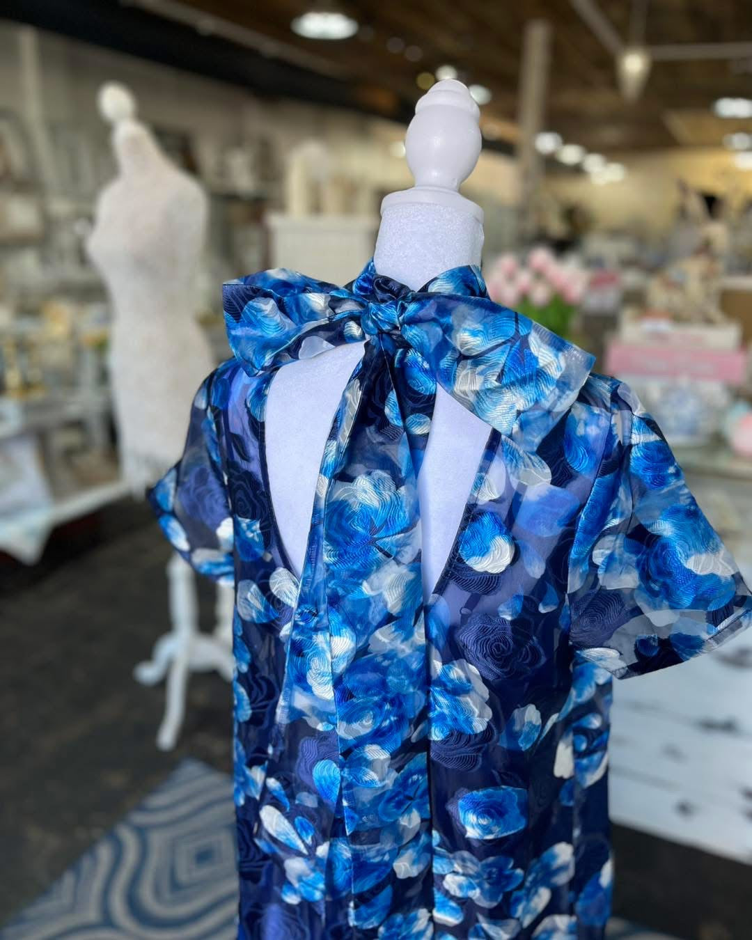 The Luda Blue maxi dress has a beautiful sheer outer layer with an under slip. The back is open with a beautiful bow tie detail.