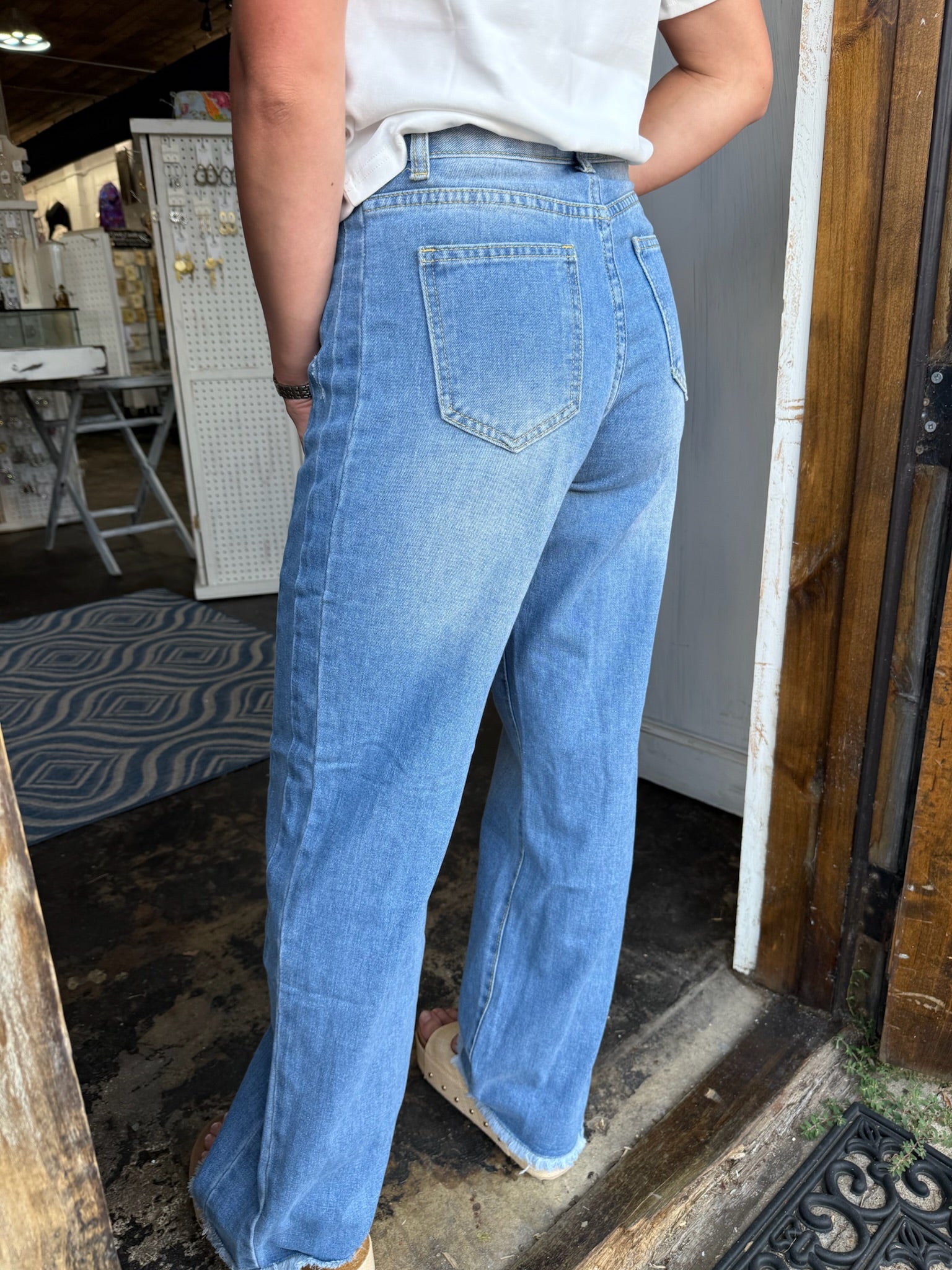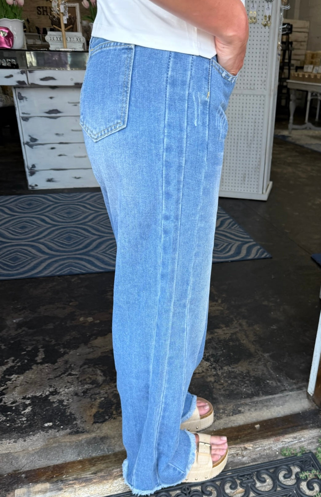 * Washed * Tassel Hem * Side Splicing Design * High Waist * Zip Front and Button Closure * With Pockets * Daily Fitting * Soft Stretch Denim * Wide Leg * Casual, Loose Fit