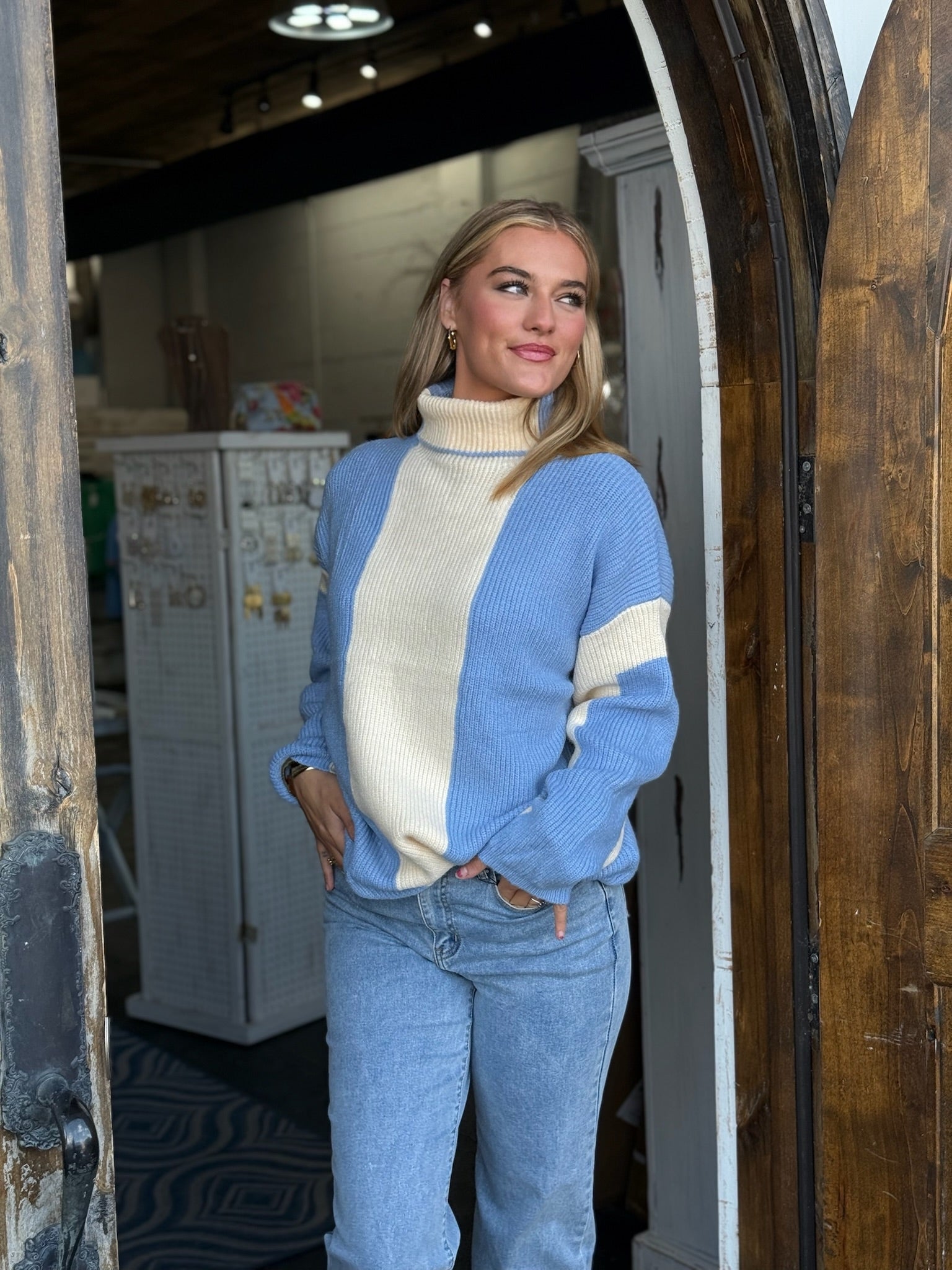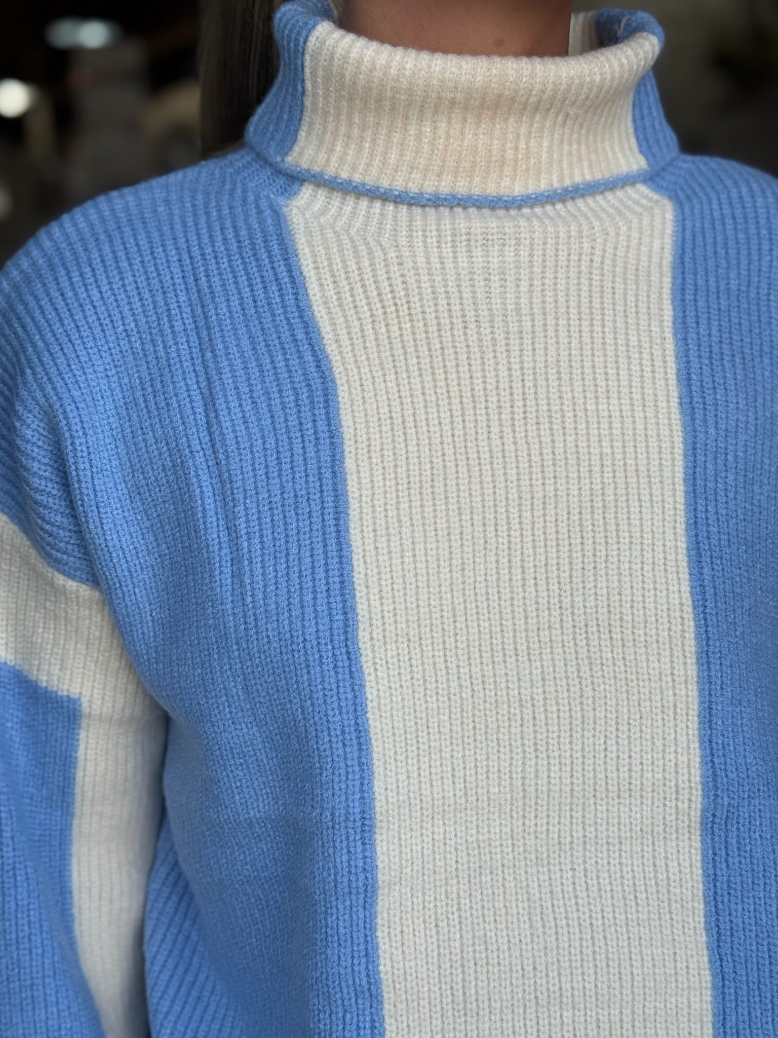 Stay effortlessly chic and cozy in our colorblock turtleneck sweater. Featuring a bold vertical stripe design in soft ivory and serene sky blue, this relaxed-fit knit adds a fresh pop to your cold-weather wardrobe. The high neckline keeps you warm, while the drop shoulders and slightly oversized silhouette create an easy, laid-back vibe. Perfect for pairing with your favorite denim or leggings for a casual yet put-together look.