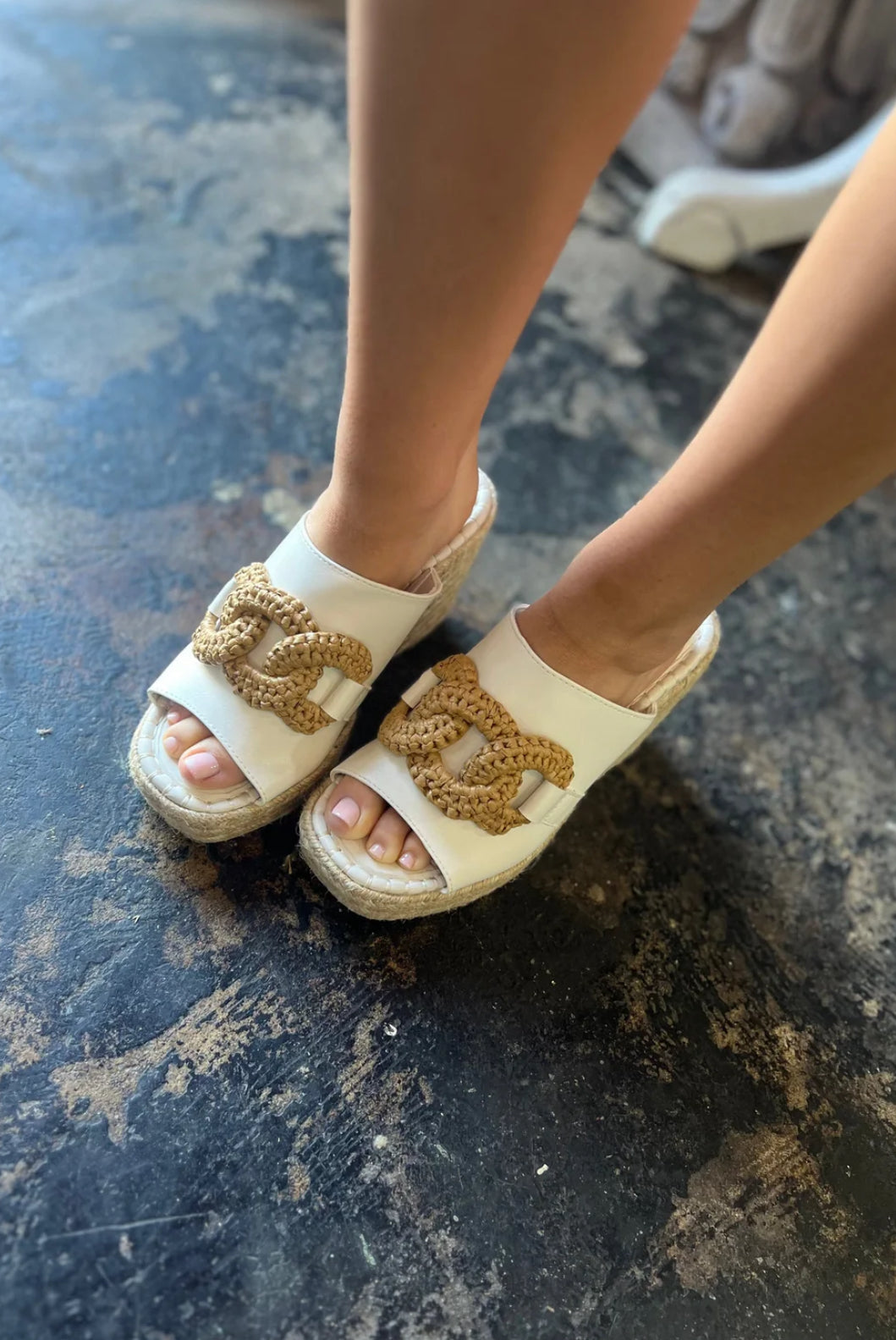Wedge slide with a Raffia detail. Neutral/Tan color.