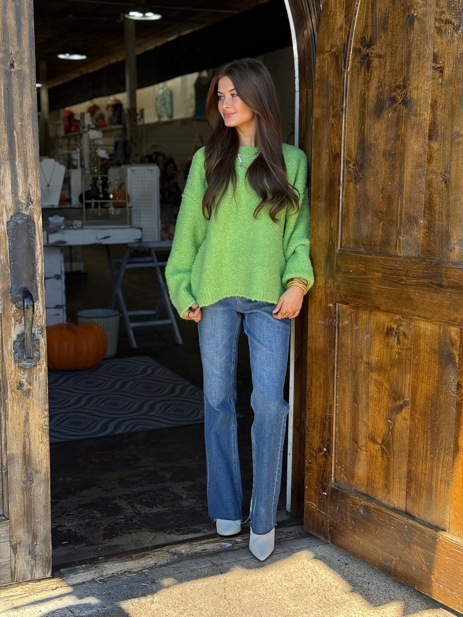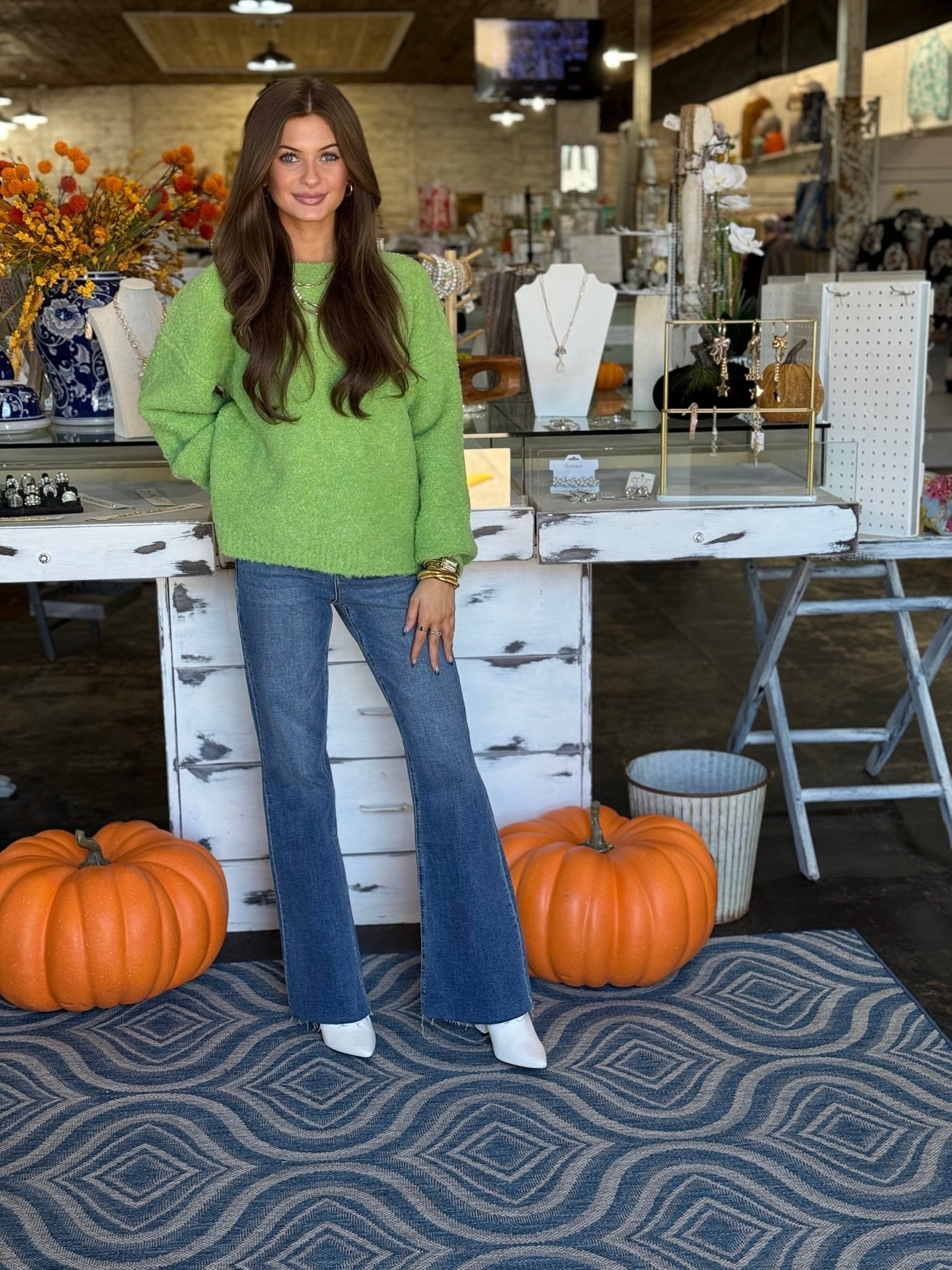 Brighten up your wardrobe with this soft, statement-making lime green sweater. Designed for ultimate comfort and effortless style, this piece features a relaxed fit, ribbed hems, and a fuzzy textured finish that feels just as good as it looks.