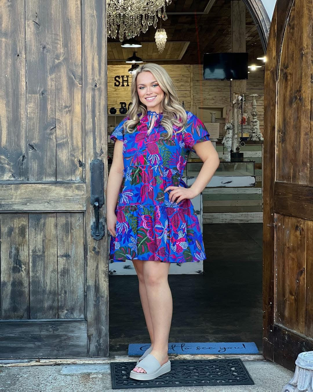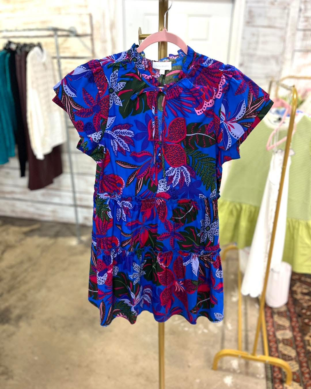 Woven mini dress that has a split neckline. The sleeves have ruffle layers.