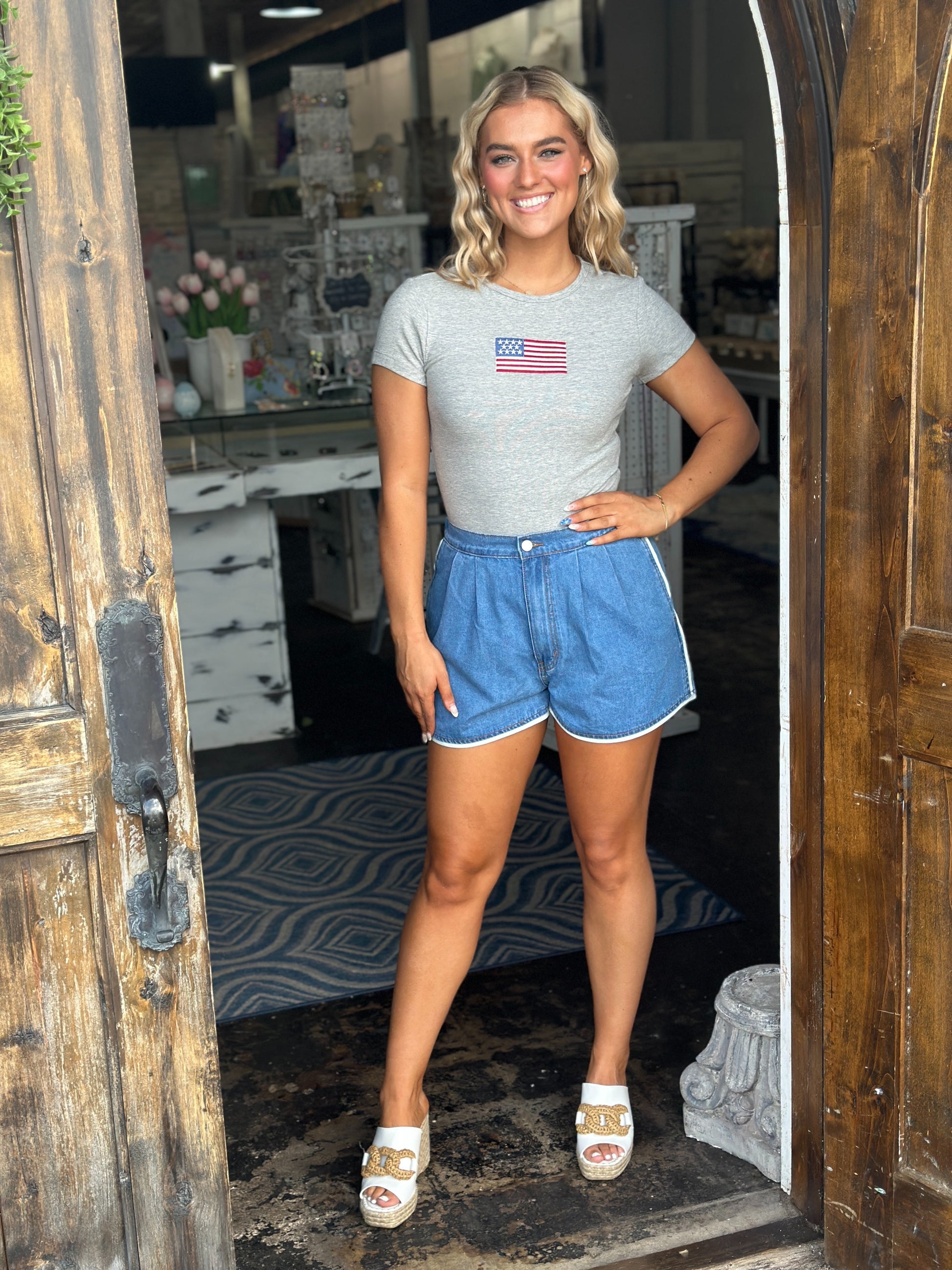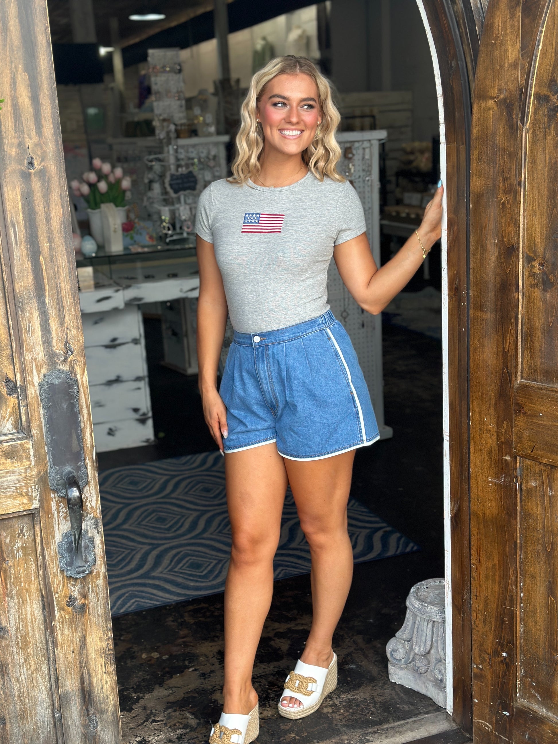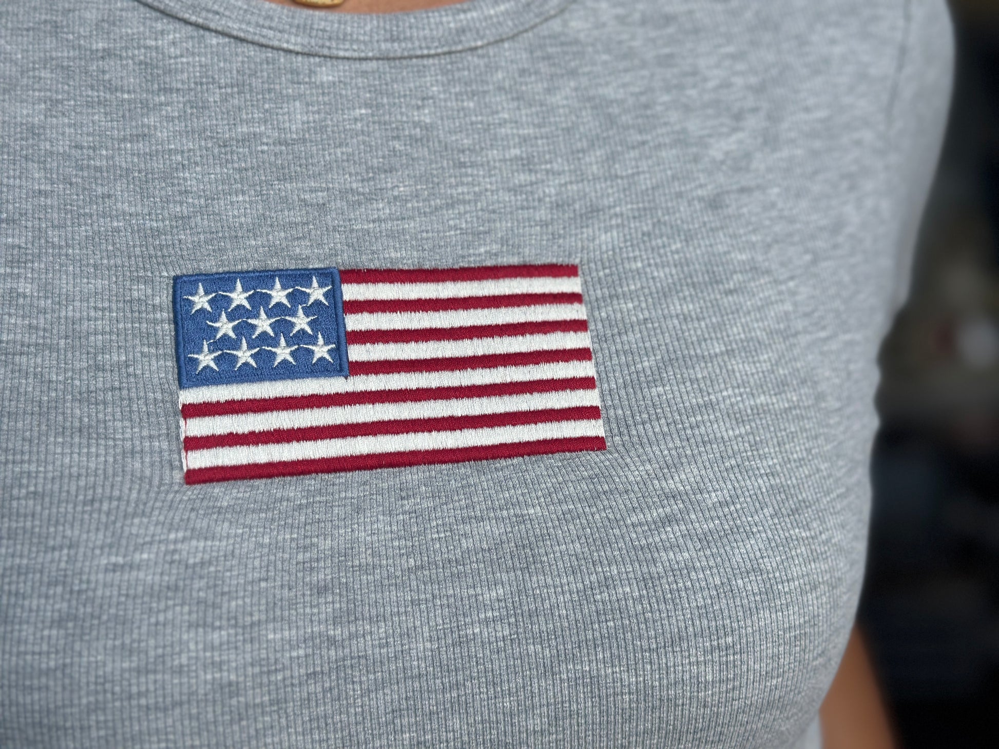 Toby Tee has an American Flag stitched detail in the center. It is also a ribbed material!