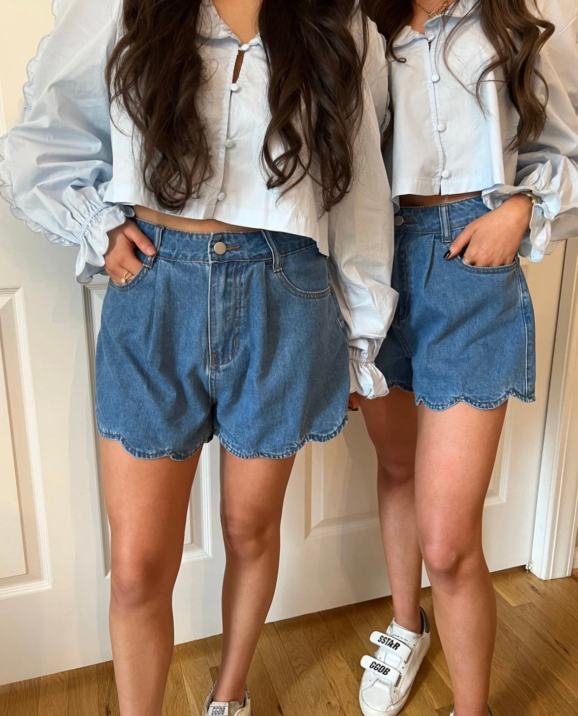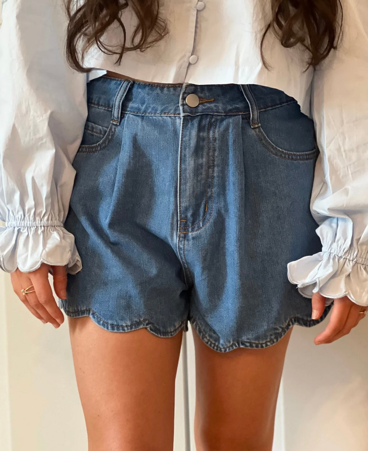 Scalloped trimmed denim shorts.