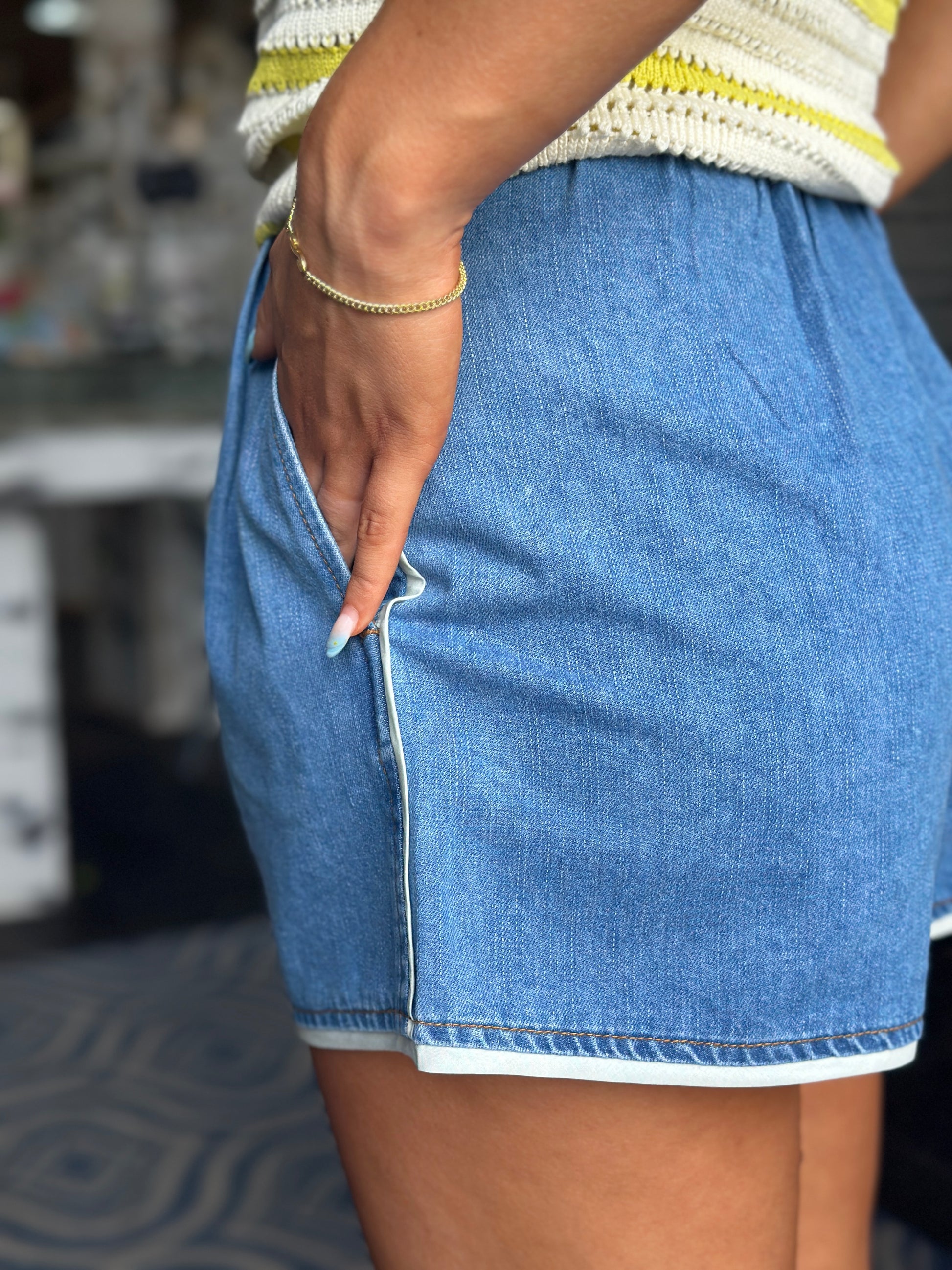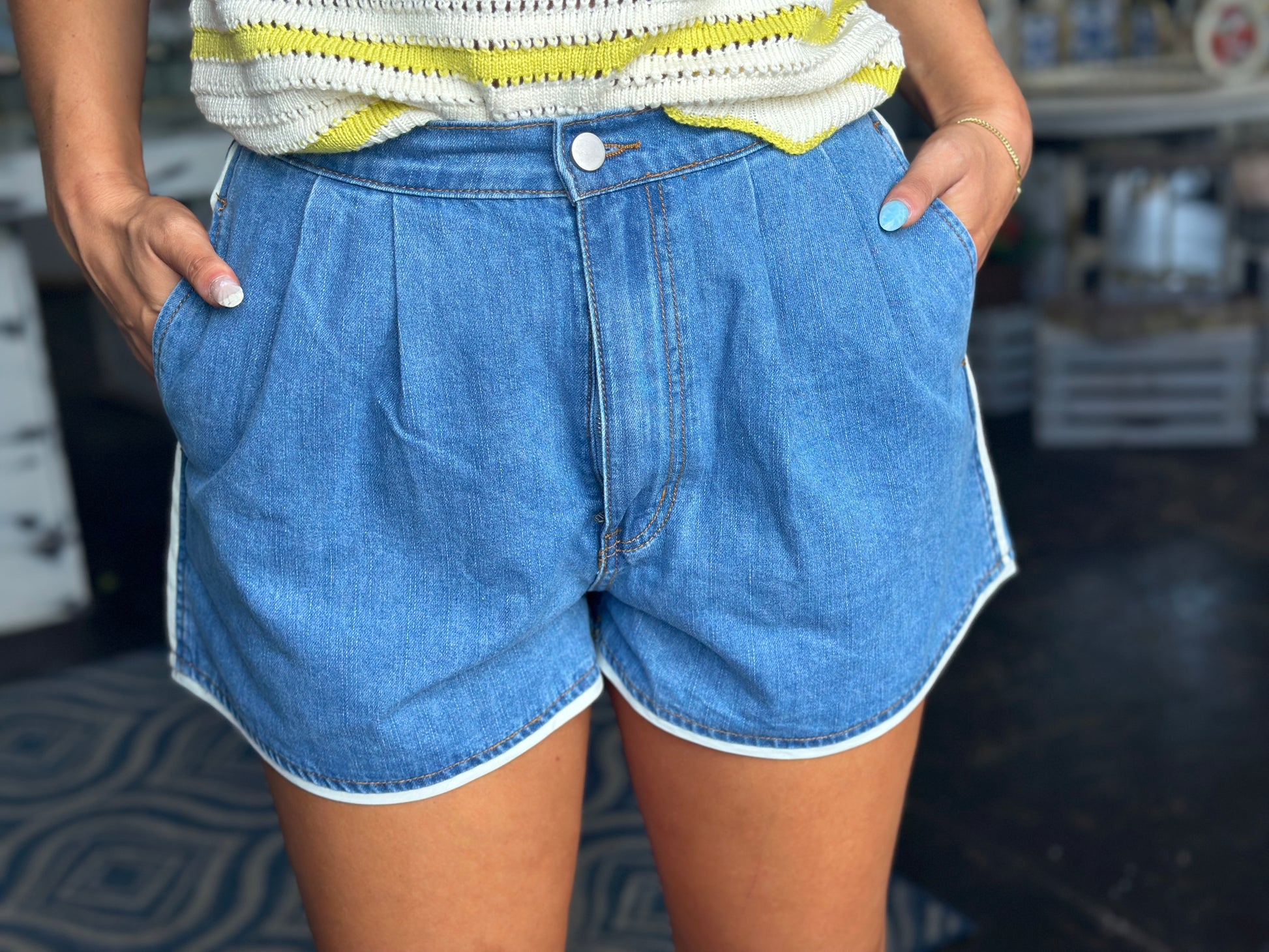 High-waisted denim shorts with a sporty twist. Designed with soft, lightweight denim, these shorts feature front pleats for a flattering fit, functional side pockets, and white contrast trim. The elastic back waistband adds extra comfort.